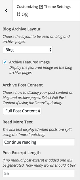 If you select, Full Post Content a “Continue reading” link will be used on blog/archive pages. Use this field to change the link text.