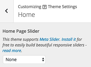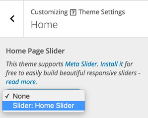 Once you’ve created your slideshow, go to AppearanceCustomizeTheme SettingsHome. There you’ll find the Home Page Slider drop-down menu. To insert your slider on the home page, select it from the list. To remove your slider revert the drop-down back to the None setting.