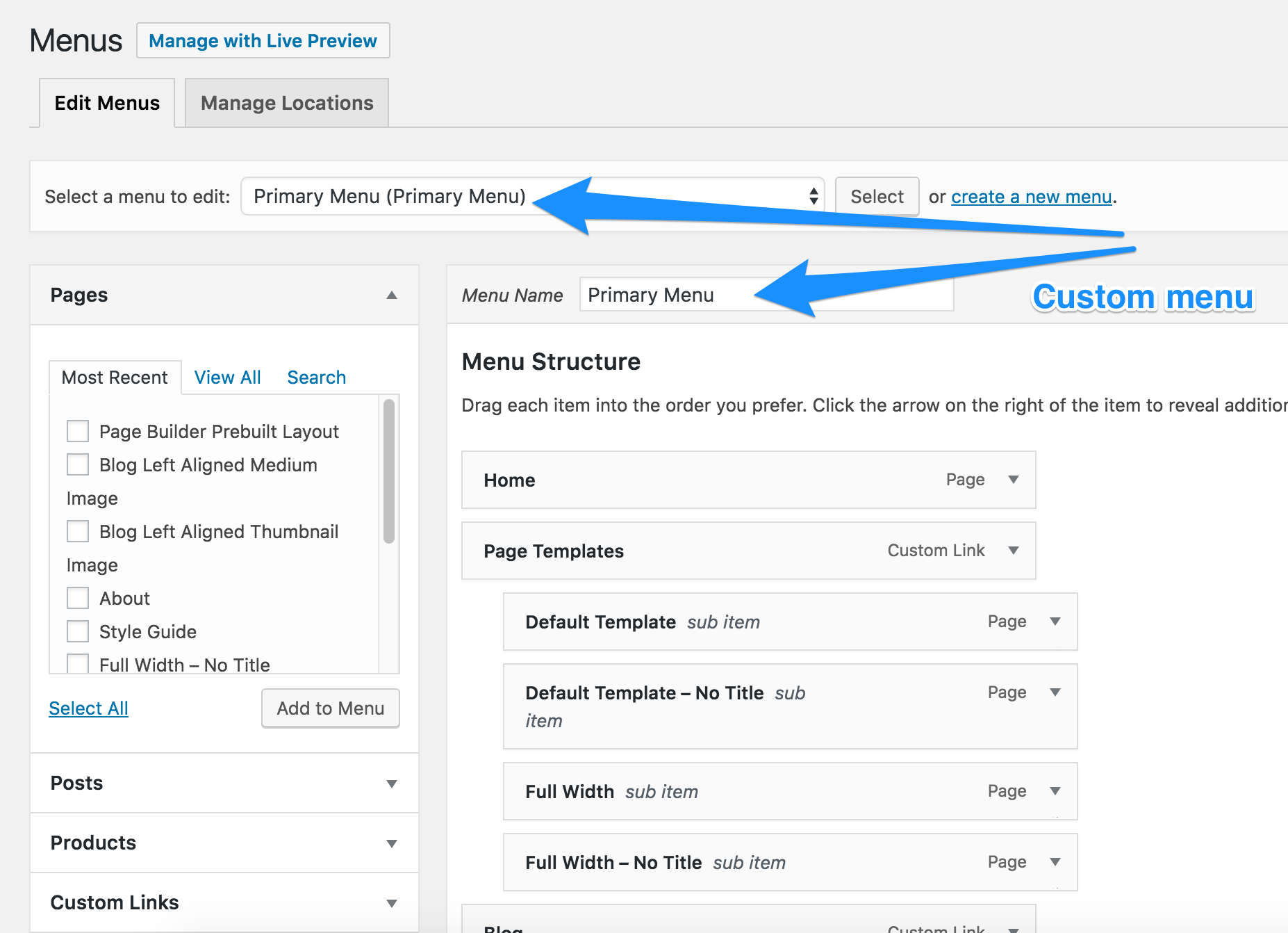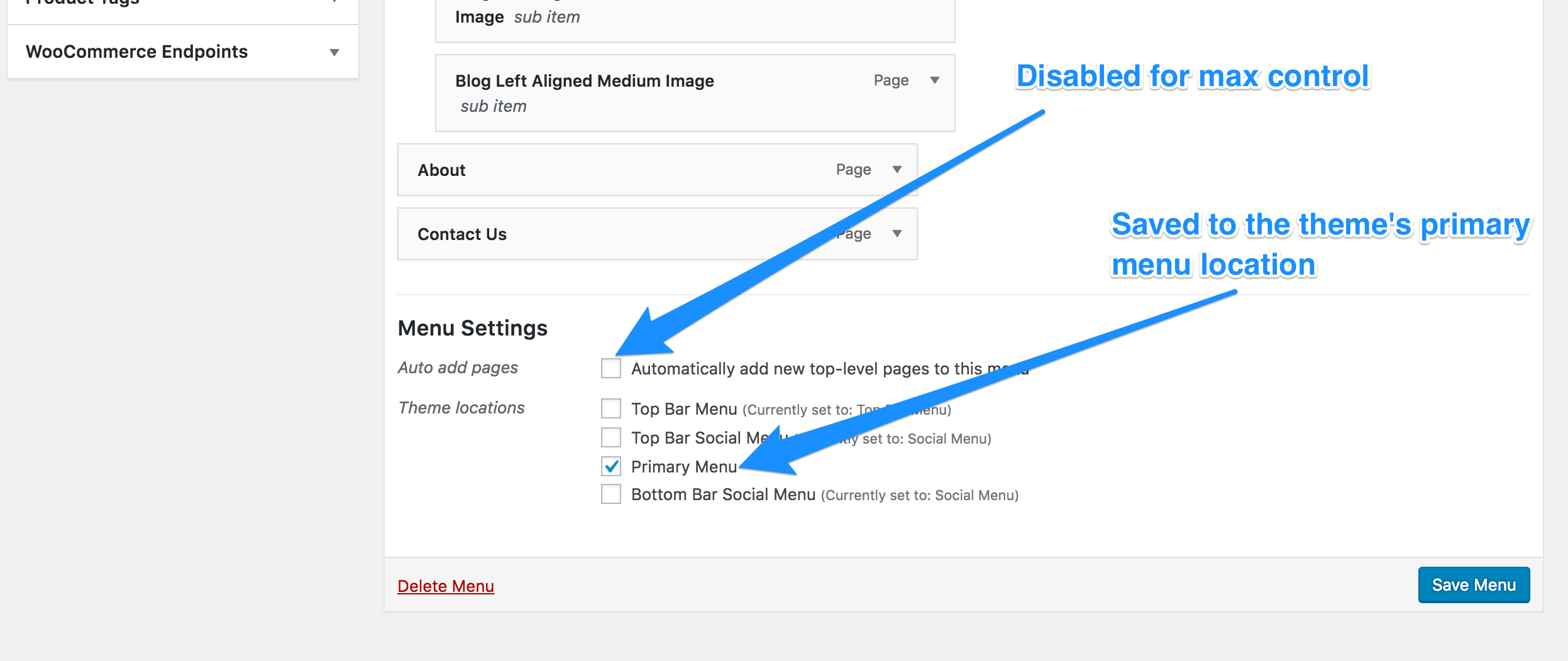 Head back over to Appearance > Menus and ensure that you have a custom menu and that your custom menu is assigned to the theme’s primary menu location. You may also want to disable the setting that automatically adds top-level pages. Once done, you should have complete menu item control.