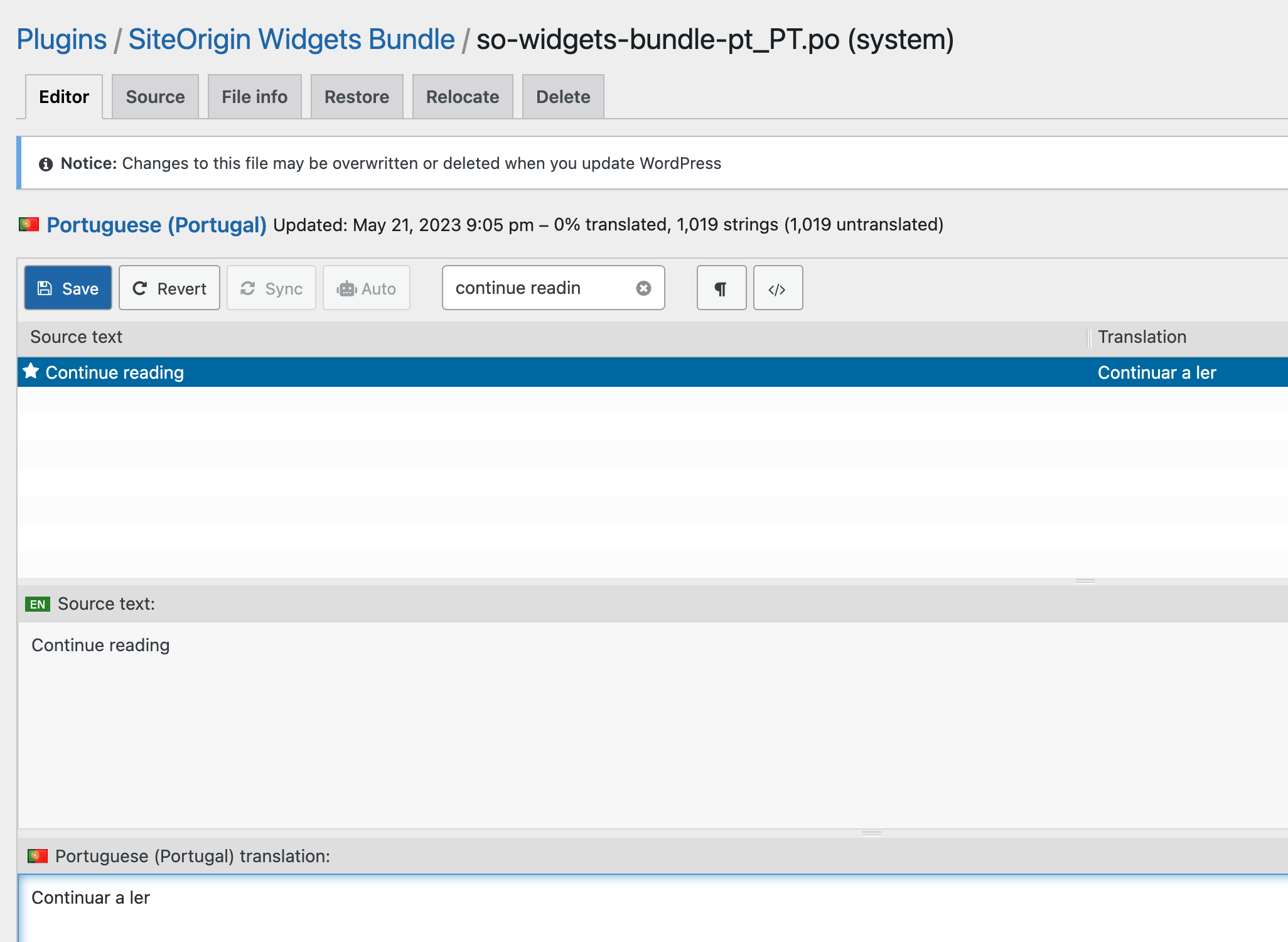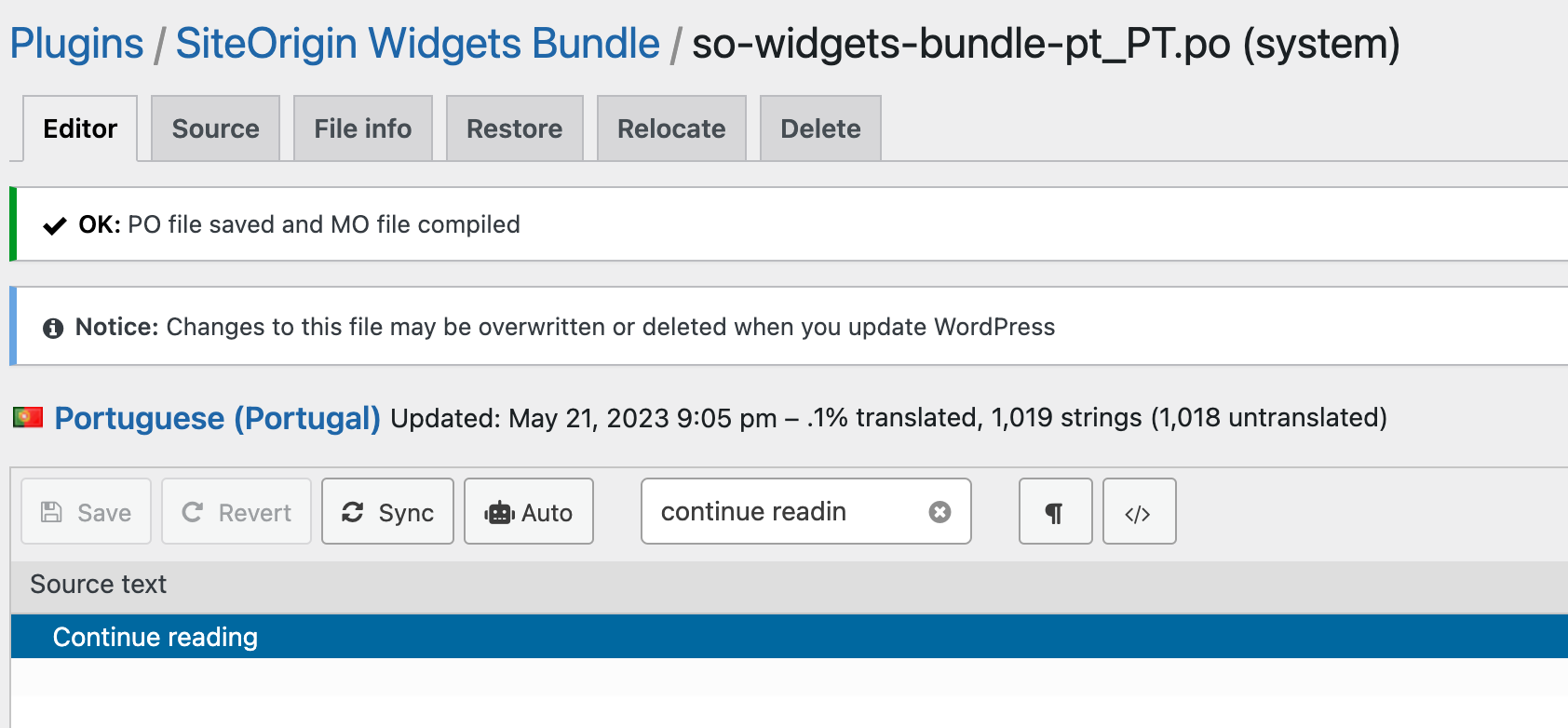 I installed loco-translate, but there I haven’t found “Continue reading”.In the siteorigin widgets bundle plugin there is a language file and here is “Continue reading”, but when I created a mo file, I hasn’t changed the text in the blog widget.