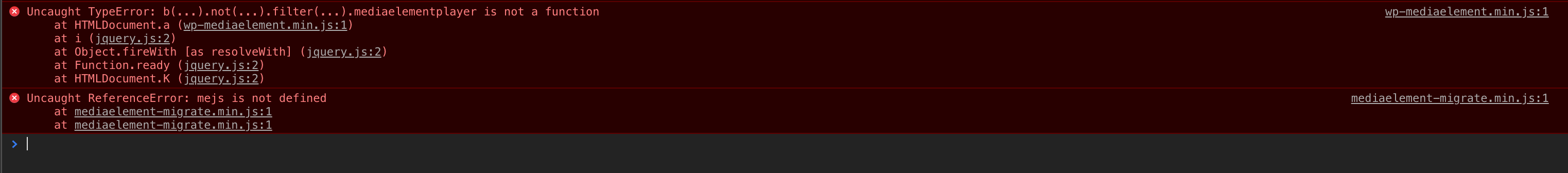 If you Google those errors, namely “Uncaught ReferenceError: mejs is not defined”, you’ll find a wide array of causes and fixes. I’d recommend starting by opening your JS console so you can see the error and test for it. https://developers.google.com/web/tools/chrome-devtools/console/. Once you can see the error start troubleshooting by: